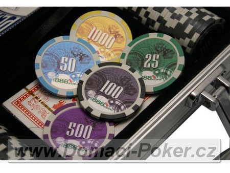 Pokerový set 750ks žetonů 888 v hliníkovém kufříku. Složení setu: - 100x pokerové žetony 11,5 gramu 888 s hodnotou 25 - 100x pokerové žetony 11,5 gramu 888 s hodnotou 50 - 200x pokerové žetony 11,5 gramu 888 s hodnotou 100 - 150x pokerové žetony 11,5 gramu 888 s hodnotou 500 - 150x pokerové žetony 11,5 gramu 888 s hodnotou 1000 - 25x pokerové žetony 11,5 gramu 888 s hodnotou 10000 - 25x pokerové žetony 11,5 gramu 888 s hodnotou 25000 - 2 balíčky kartonových karet (plastic coated cards, 1 balíček = 52 karet + 2xJoker) - hliníkový kufřík na 750 žetonů s rukojetí pro snazší přenášení či převoz žetonů - dealer button pro označení rozdávajícího hráče